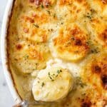 Yes! One of the best things about this creamy potatoes au gratin recipe is its make-ahead nature. Assemble it, cover tightly, and refrigerate for up to 24 hours before baking. Just add extra baking time if baking right from cold.