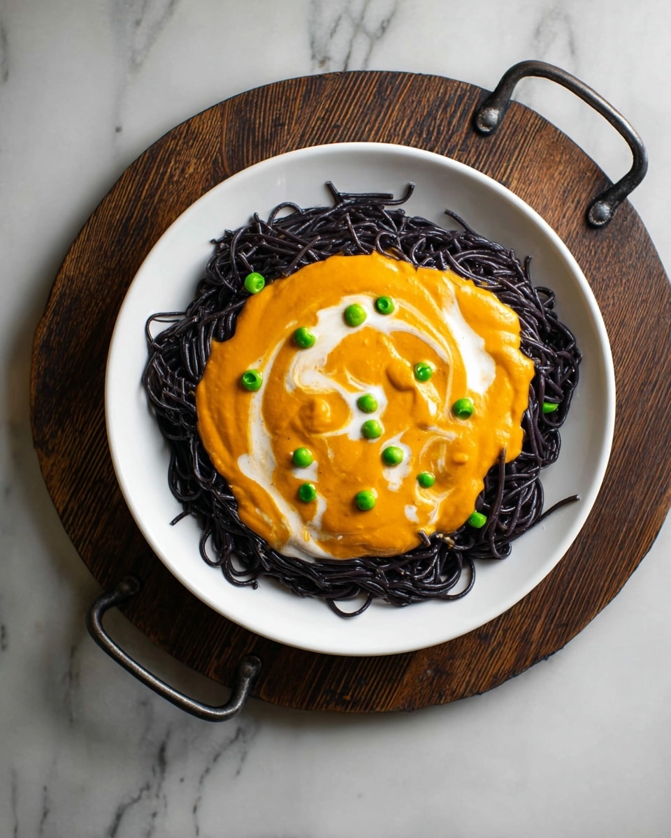 - Prepare Pasta and Serve: Cook Black Rice Pasta or Squid Ink Pasta as per package instructions. For large groups, toss pasta directly into the sauce and top with peas. Alternatively, serve pasta in individual bowls topped with sauce and garnish with peas or a drizzle of cream.