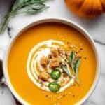 I love topping this soup with a few fresh garnishes to add texture and flavor. My go-to is a sprinkle of toasted pumpkin seeds for crunch and a little chopped fresh cilantro to brighten every bite. A drizzle of coconut cream or a dollop of Greek yogurt also looks beautiful and adds a silky touch tempers the spices. If you like it spicy, chopped fresh chili or a dash of chili oil on top is fantastic.