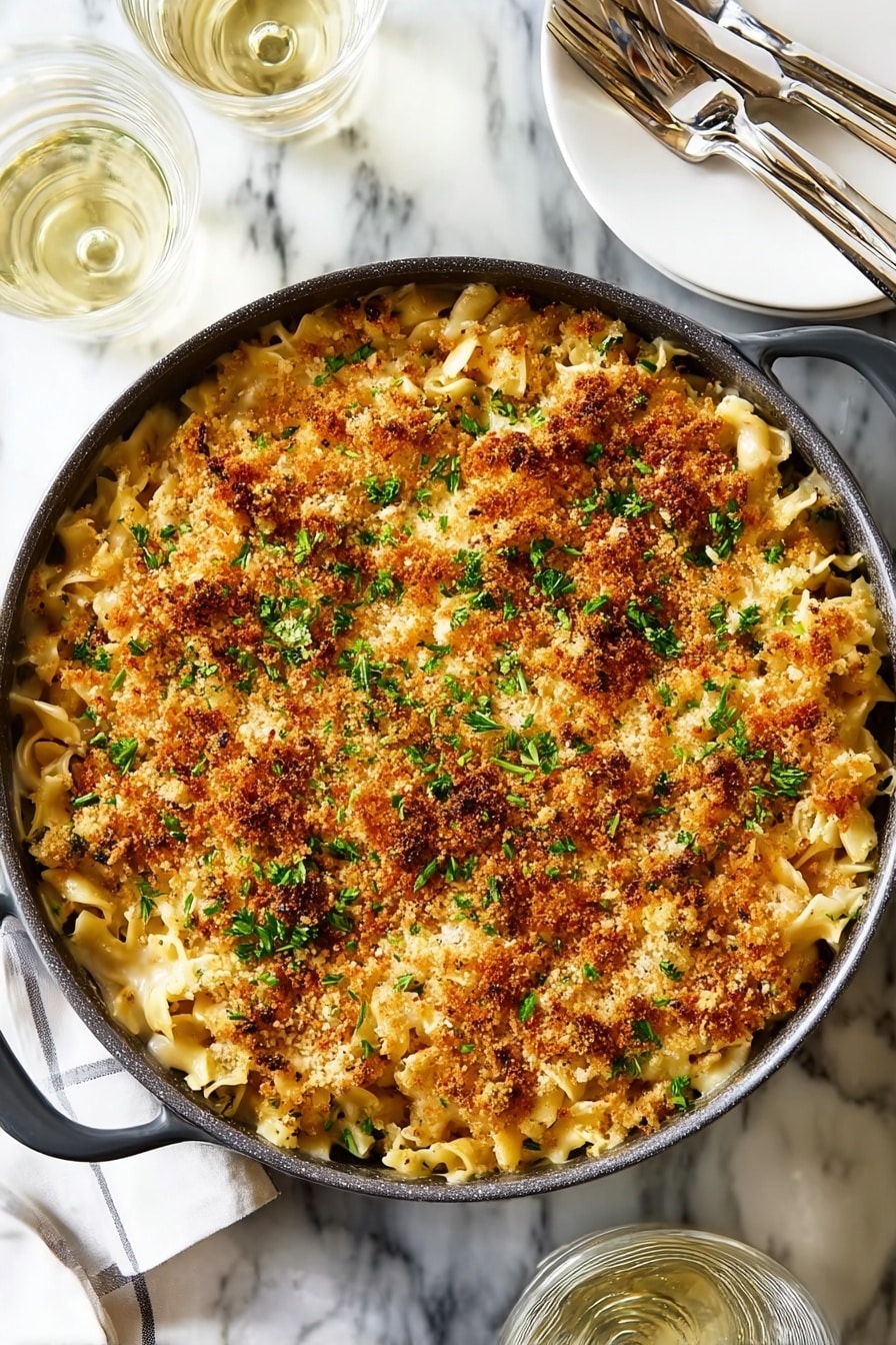 Transfer the casserole mixture into a greased baking dish or keep it in your Dutch oven if oven-safe. Sprinkle the panko mixture evenly over the top. Bake in a preheated 400°F oven for 25 to 30 minutes until bubbly and that topping is beautifully golden brown. Your kitchen will smell like a cozy little bistro — and honestly, waiting is half the fun.
