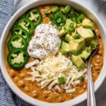 - Serve with toppings: Ladle the chili into bowls and top with shredded Monterey Jack or Pepper Jack cheese, diced avocado, fresh cilantro, sliced jalapeno, and chopped scallions as desired.
