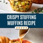 Once baked, you might need to run a knife gently around the edges to loosen each muffin. Transfer to a serving tray and don’t forget the gravy! A generous drizzle of turkey gravy over these Crispy-Edged Stuffing Muffins (Stuffins) Recipe makes them downright irresistible.