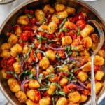 This Crispy Gnocchi with Cherry Tomato Sauce recipe transforms store-bought gnocchi into a golden, crispy delight. Searing the gnocchi in olive oil develops a crunchy exterior, while a vibrant cherry tomato and roasted red pepper sauce infused with garlic, lemon zest, and fresh basil adds a flavorful, fresh touch. This easy, one-pan dish is perfect for a quick weeknight dinner that feels both comforting and elegant.