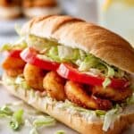 Classic Louisiana Shrimp Po Boy Sandwiches featuring crispy fried shrimp, fresh shredded lettuce, juicy tomato slices, and a zesty homemade remoulade sauce served on soft French sandwich rolls. This flavorful sandwich combines Cajun-spiced breading and a creamy, tangy sauce for an authentic Southern experience.