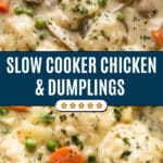 This Crockpot Chicken and Dumplings recipe is a comforting slow cooker dish featuring tender chicken breasts simmered with chopped carrots, celery, potatoes, peas, and aromatic herbs in a flavorful, thickened chicken broth base. Fluffy homemade dumplings made from scratch are added towards the end for a hearty and satisfying meal perfect for cozy family dinners.