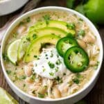 Return the shredded chicken to the crockpot and stir in fresh cilantro. Serving with a squeeze of lime juice really brightens the flavors—I don’t skip this step. Then garnish to your heart’s content and enjoy! My family usually goes crazy for shredded cheese and crunchy tortilla chips on top, but the avocado and sour cream combo is a great cool contrast on warmer days.
