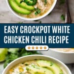 This Crockpot White Chicken Chili is a hearty and healthy slow-cooked dish featuring tender chicken breasts, creamy white beans, and spicy green chiles. Infused with warm cumin, oregano, and fresh cilantro, it’s a comforting and flavorful chili perfect for easy weeknight dinners. The chili is thickened by pureeing a portion of the beans, giving it a creamy texture without cream. Serve it with fresh lime, jalapeños, avocado, and your favorite toppings for a satisfying meal.