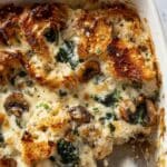 This Overnight Croissant Breakfast Bake is a delicious make-ahead dish featuring toasted buttery croissants layered with sautéed mushrooms, spinach, and a rich custard of eggs, milk, and cream, all topped with melted Gruyere and Parmesan cheese. Perfect for a hearty breakfast or brunch, this casserole is prepped the night before and baked fresh in the morning for a comforting and flavorful start to your day.