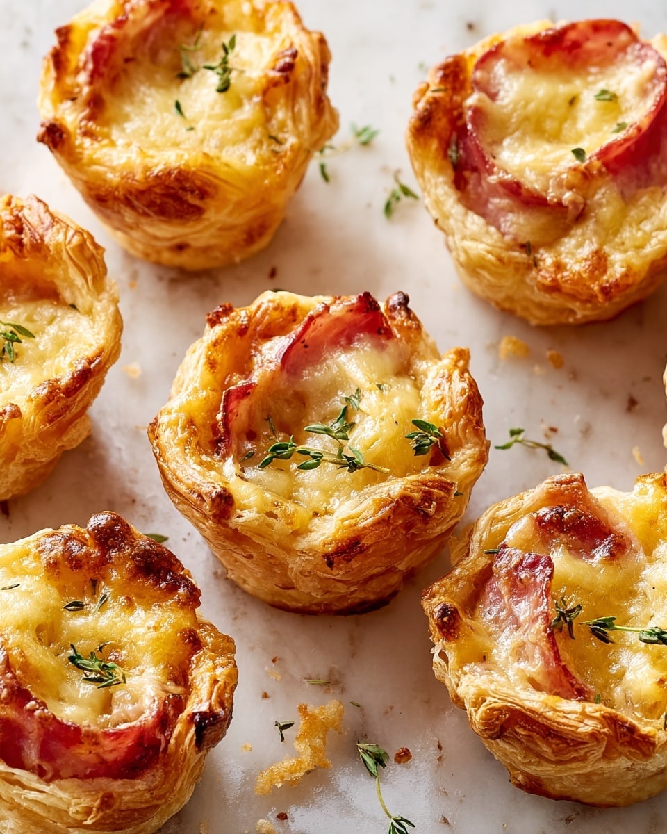These Croque Monsieur Bites are a delightful twist on the classic French sandwich, featuring layers of ham and melted Gruyère and Swiss cheeses inside flaky puff pastry cups, topped with a savory béchamel sauce and Parmesan. Perfect as a party appetizer or elegant snack, they combine rich, creamy flavors with a crispy golden crust.