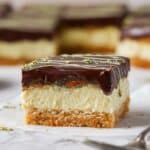 - Top and Serve: Pour the chocolate ganache evenly over the chilled cheesecake bars, smoothing the top with a spatula. Optionally, garnish with additional kataifi or pistachio pieces for added texture and presentation. Refrigerate again for 30 minutes to set the ganache before slicing into bars and serving.