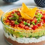 This classic 7 Layer Dip is a crowd-pleasing appetizer featuring layers of spicy refried beans, fresh guacamole, seasoned sour cream, chunky salsa, shredded cheese, fresh diced tomatoes, and sliced black olives. Perfect for parties and gatherings, it combines bold flavors and creamy textures for an irresistible dip served with crispy tortilla chips.