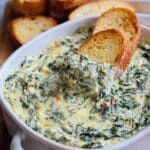 - Serve: Serve the hot spinach dip immediately with crackers or slices of baguette for dipping.