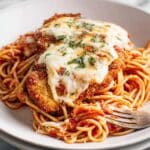 Spoon a thin layer of marinara into the bottom of a 9×13” baking dish and arrange the chicken pieces on top. Spoon more marinara over each chicken breast, then sprinkle with mozzarella and the remaining Parmesan cheese. Bake uncovered for 10-15 minutes until the cheese is melted, bubbly, and the chicken reaches 165°F. It’s amazing how the oven finishes everything off, melding the flavors together beautifully.