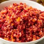 Grandma’s Cranberry Relish is a classic, old-fashioned recipe featuring fresh cranberries, navel orange, and granny smith apple finely chopped and mixed with sugar and cinnamon. This refreshing and tangy relish is perfect for holiday meals, especially Thanksgiving or Christmas, providing a sweet and zesty complement to turkey or ham.