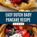 - Cool and Serve: Remove the Dutch baby pancake from the oven and allow it to cool for about 5 minutes. Dust the top with confectioners’ sugar and add your preferred toppings such as fresh berries, whipped cream, maple syrup, or strawberry sauce. Slice and serve immediately for the best texture and flavor. Leftovers can be refrigerated for up to 5 days or frozen for up to 2 months.