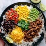 - Assemble the Taco Bowls: Divide the cooked rice between bowls. Top each with the seasoned beef mixture, the black bean and corn medley, and then garnish with fresh cilantro and a squeeze of lime juice for brightness.
