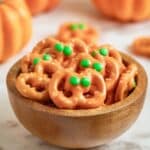 While you can technically try regular pretzels, the mini pretzels with indentations work best because the green M&M “stem” fits perfectly in those little dips. Larger pretzels won’t hold the candy stem the same way and might not look as pumpkin-like.