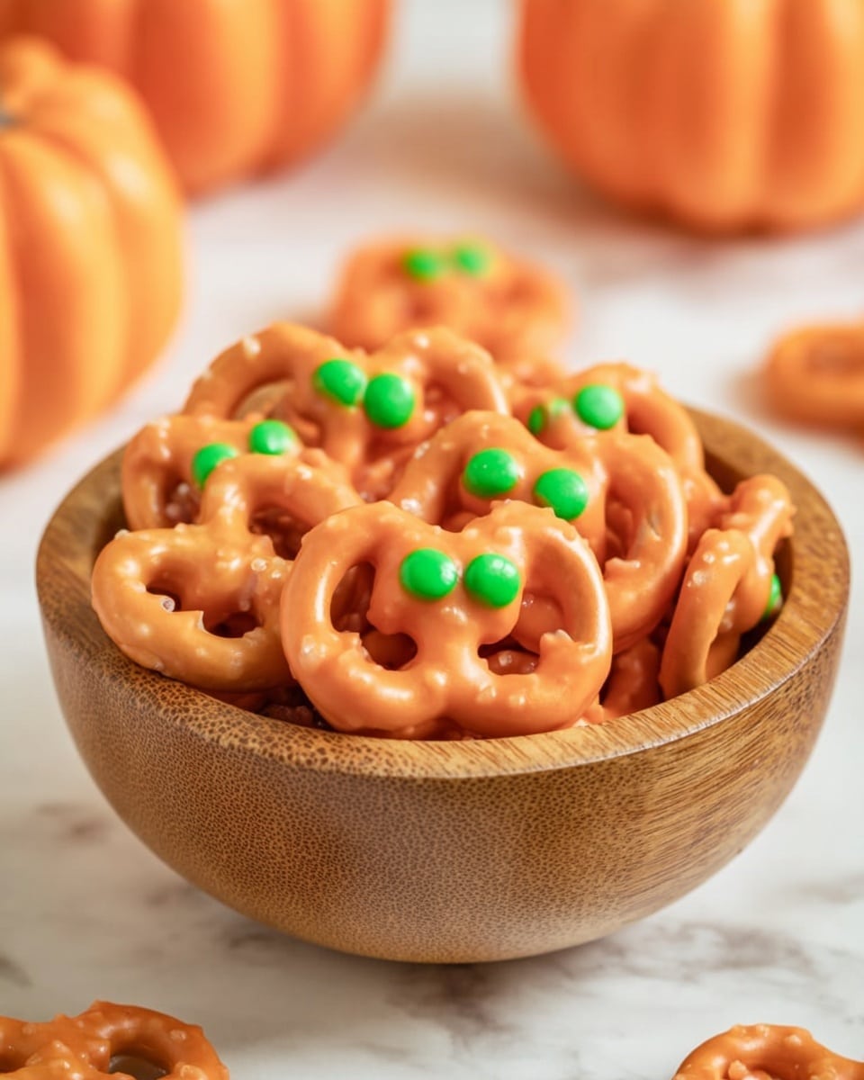 I like to sprinkle a tiny pinch of edible glitter or some orange sugar crystals over the pretzels right after dipping to add sparkle and texture. It gives a festive touch, perfect if you’re serving these at a Halloween party or fall event.