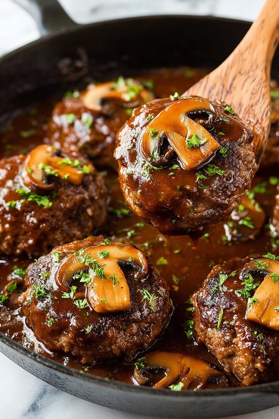 - Finish the Dish: Return the cooked patties to the skillet, spoon the gravy over them, and heat through for another minute. Garnish with parsley if desired and serve hot over mashed potatoes or your favorite side.