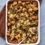 Absolutely! You can assemble the entire stuffing up to a day ahead, keep it covered and refrigerated, then bake it fresh when you’re ready. Just add a few extra minutes to the baking time since the stuffing will be cold going into the oven.