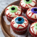 These spooky Eyeball Cupcakes are a fun and festive Halloween treat featuring classic red velvet cupcakes topped with creamy vanilla buttercream and decorated with colorful fondant irises and edible fake blood for a realistic eyeball effect. Perfect for parties, they combine moist, fluffy cupcakes with creative, edible decorations that are both playful and delicious.
