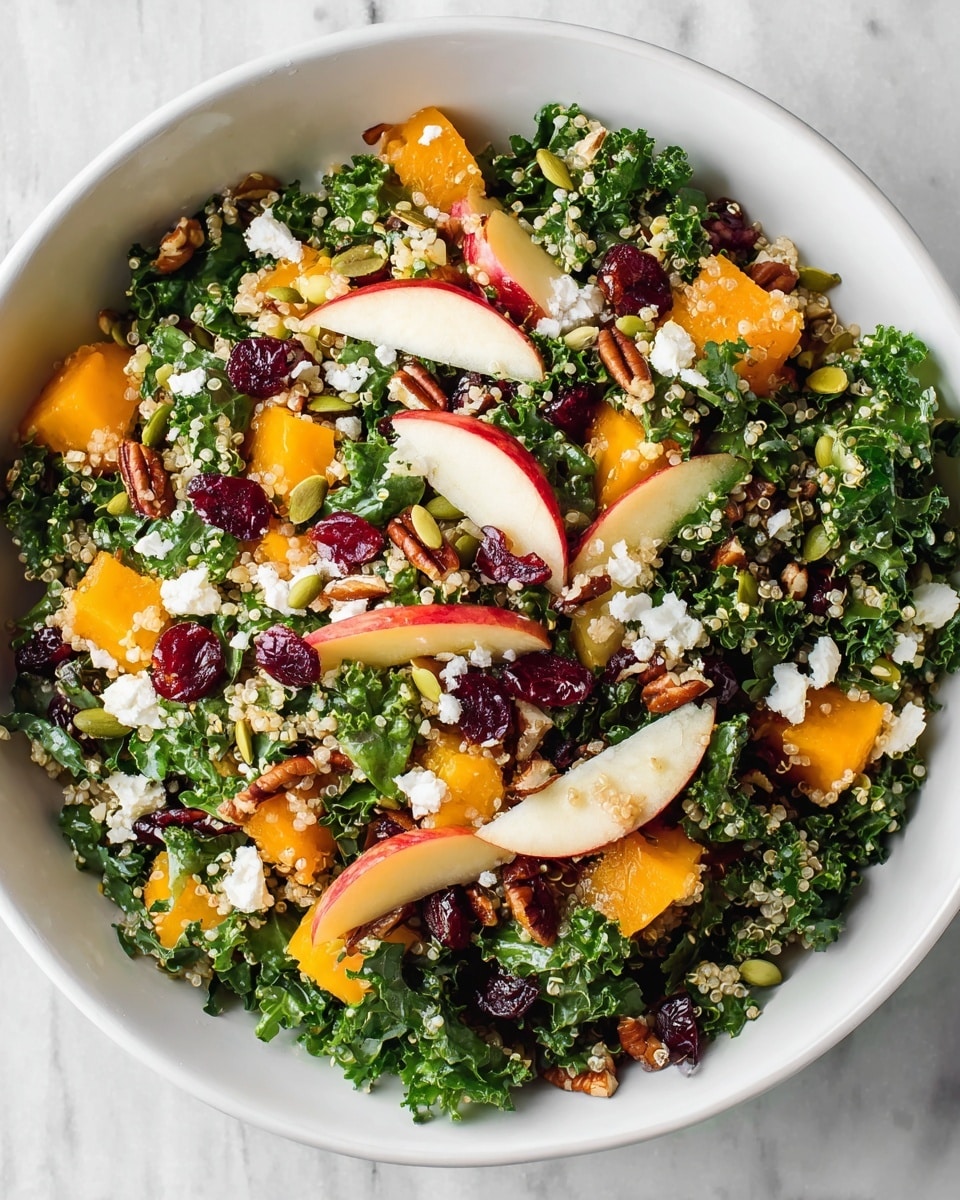 - Assemble the Salad: To the massaged kale, add the cooled quinoa, roasted butternut squash, and chopped apples. Toss everything together gently to combine well. Divide the salad evenly between 3 plates. Top each portion with pecans, pumpkin seeds, dried cranberries, and crumbled feta cheese. Drizzle with the remaining vinaigrette just before serving to enhance freshness.