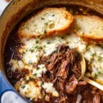For a special occasion, I sometimes serve this French Onion Pot Roast Recipe in mini Dutch ovens right at the table—they add a cozy, rustic charm. Another favorite is layering the shredded beef and sauce over a baked potato or polenta cake, topped with melty cheese and fresh herbs. It’s fun, impressive, and super comforting!