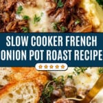 This French Onion Pot Roast is a hearty and flavorful dish featuring a tender, slow-braised chuck roast infused with rich caramelized onions, garlic, fresh herbs, and a hint of white wine. Topped with melted Gruyere cheese and served with toasted baguette slices, it’s a comforting, elegant meal perfect for family dinners or special occasions.