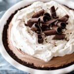 - French Silk Pie features an Oreo cookie crust, rich and creamy chocolate filling, and is topped with homemade whipped cream and chocolate shavings.
