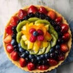 This Fresh Fruit Tart features a crisp, buttery crust filled with a smooth, creamy vanilla pastry cream and topped with a vibrant assortment of fresh seasonal fruits. Perfect for showcasing summer berries and stone fruits, this classic dessert combines baking essentials with a visually stunning presentation.