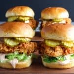 Crispy and flavorful baked fried chicken sliders served on soft toasted Hawaiian rolls, layered with shredded lettuce, tangy dill pickle slices, and a spicy sriracha aioli sauce. These sliders are perfect for a casual meal or game day gathering, offering a delightful combination of textures and a kick of heat without the mess of deep frying.