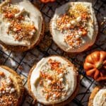 - Frost and decorate: Once the cookies have cooled completely, frost each cookie generously with the cream cheese frosting. Finish by decorating with fall-themed sprinkles to add a festive touch.
