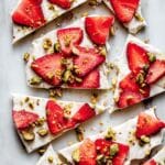 Enjoy a refreshing and healthy Frozen Yogurt Bark, perfect for hot summer days. This easy-to-make treat combines creamy vanilla yogurt with fresh sliced strawberries and crunchy pistachios, creating a delightful snack that’s both satisfying and nutritious. Ideal as a kid-friendly dessert or a wholesome ice cream alternative, this recipe is highly customizable with your favorite toppings.