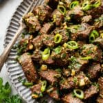 Pop the steak bites back into the skillet and stir them around so every piece gets coated in that flavorful buttery garlic goodness. Let them cook for another minute or two to warm up and soak in the sauce. Then, take the pan off the heat and sprinkle with chopped parsley for freshness and color. Garnish with sliced green onion if you like, and you’re ready to dig in!
