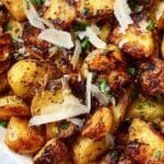 Once out of the oven, transfer your potatoes to a serving dish and sprinkle with freshly grated Parmesan cheese and chopped parsley, if using. The cheese melts ever so slightly on the warm potatoes, adding a savory richness that I find absolutely irresistible. Serve immediately for the best texture.