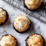 Kokosmakronen, traditional German coconut macaroons, are delightfully crisp on the outside and chewy on the inside. Made with shredded coconut, sweetened condensed milk, egg whites, vanilla, and a hint of salt, these cookies are simple to prepare with just one bowl and no need to whip the egg whites. For an extra indulgence, you can dip the bases in melted dark chocolate, adding a rich contrast to the sweet coconut flavor.