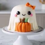 13. Decorate the Ghost Face and Pumpkin: Lightly mark face and pumpkin placement with a toothpick. Pipe facial features with black frosting. Add rosy cheeks with pink buttercream. Pipe an orange pumpkin below the face and a small bow on one side of the ghost’s head. Pipe white arms of the ghost, then use brown and green frosting to add pumpkin details like a stump and leaf. Enjoy your festive ghost cake!