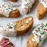 - Decorate biscotti: Dip the cooled biscotti into the melted white chocolate or use a piping bag to create decorative swirls on top. Optionally, sprinkle with festive sprinkles. Place the decorated biscotti on waxed paper and let the chocolate set fully before serving.