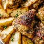 This recipe works so well because the classic combination of lemon, garlic, and herbs pairs perfectly with tender chicken and golden potatoes. When shopping, opt for fresh herbs and a good quality extra virgin olive oil — it really makes the marinade shine.