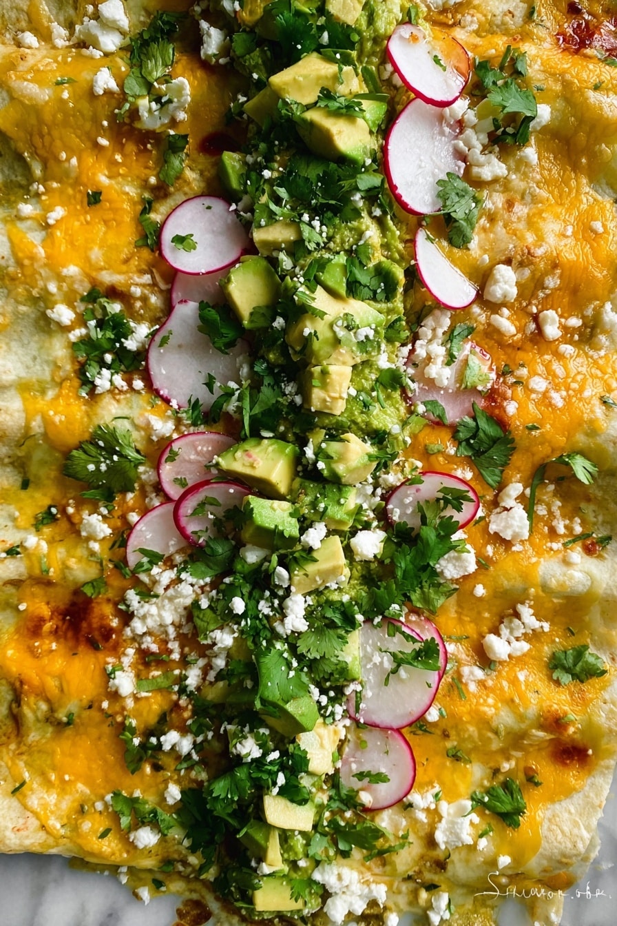 For special occasions, I’ve arranged these enchiladas in a circular pattern in a round dish, sprinkled with chopped green onions and fresh jalapeño slices for color and flair. Serving them with mini bowls of all the toppings lets guests customize their plates, which is always a hit at parties.