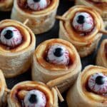 This is where the magic really happens. Stick candy eyes on top of each sushi roll to give them that “creepy cute” Halloween vibe—my kids love arranging the eyes and telling ghost stories while snacking. They’re the perfect finishing touch that turns a simple roll into spooky sushi. Serve them immediately to keep the bananas fresh and the tortilla from getting soggy.