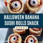 This is where the magic really happens. Stick candy eyes on top of each sushi roll to give them that “creepy cute” Halloween vibe—my kids love arranging the eyes and telling ghost stories while snacking. They’re the perfect finishing touch that turns a simple roll into spooky sushi. Serve them immediately to keep the bananas fresh and the tortilla from getting soggy.