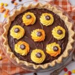 Celebrate Halloween with this festive Halloween Brownie Pie featuring a rich, fudgy brownie base baked inside a flaky pie crust, studded with colorful Halloween M&M’s, and topped with vibrant swirls of orange, yellow, and white buttercream frosting adorned with candy accents. Perfect for spooktacular parties and seasonal treats.