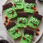 These Halloween Rice Krispies Treats are a fun and festive twist on the classic snack, designed to look like Frankenstein’s Monster. With bright green marshmallow coating, chocolate-dipped ends, candy eyeballs, and Reese’s Minis as neck bolts, these treats are perfect for a spooky celebration. Easy to make and delicious to eat, they combine crunchy Rice Krispies cereal with gooey marshmallow and festive decorations to delight kids and adults alike.