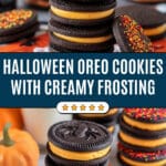 Fill a piping bag fitted with tip #10 with frosting and pipe a generous swirl onto half the cookies. Press the remaining cookies on top to make sandwiches, applying gentle pressure so the frosting spreads evenly. If you want, roll the edges in colorful sprinkles for a fun finishing touch. And that’s it — your homemade Halloween Oreos are ready to wow!
