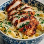 Slice the rested chicken and gently fold it into the saucy pasta. This step allows the chicken to soak up a bit of sauce and keeps everything warm and comforting. I sprinkle chopped fresh parsley or chives and a generous handful of extra Parmesan over the top before serving—trust me, it adds that fresh pop and cheesy goodness everyone loves.