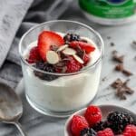 A quick and healthy Greek Yogurt Berry Parfait made with creamy FAGE 2% plain Greek yogurt, fresh mixed berries, and topped with crunchy sliced almonds, granola, and dark chocolate shavings. Perfect as a nutritious breakfast, snack, or light dessert.