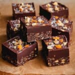 These No Bake Superfood Brownies are a healthy, gluten-free, and vegan treat, naturally sweetened with dates and packed with mixed nuts and dried fruits. They feature a rich chocolate topping sprinkled with fleur de sel, making them a delicious, guilt-free snack or dessert that requires no baking and is quick to prepare.