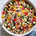 A hearty and flavorful Dense Bean Salad featuring chickpeas, cannellini beans, crisp bell peppers, cucumbers, olives, and crumbled feta cheese, all tossed in a tangy oregano-garlic vinaigrette. This protein-packed salad is perfect for meal-prepped lunches or potluck gatherings and is best served chilled to enhance the flavors.