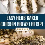 This herb baked chicken breast recipe features juicy, tender chicken breasts infused with a flavorful blend of garlic powder, dried basil, thyme, and oregano. Quickly prepared with simple ingredients and baked to perfection, it’s a perfect easy weeknight dinner that’s both delicious and healthy.